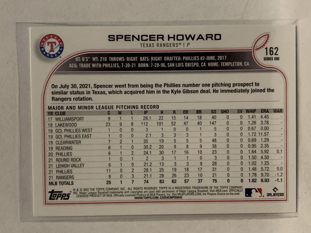 # 162 Spencer Howard Texas Rangers 2022 Topps Series 1 Baseball Card