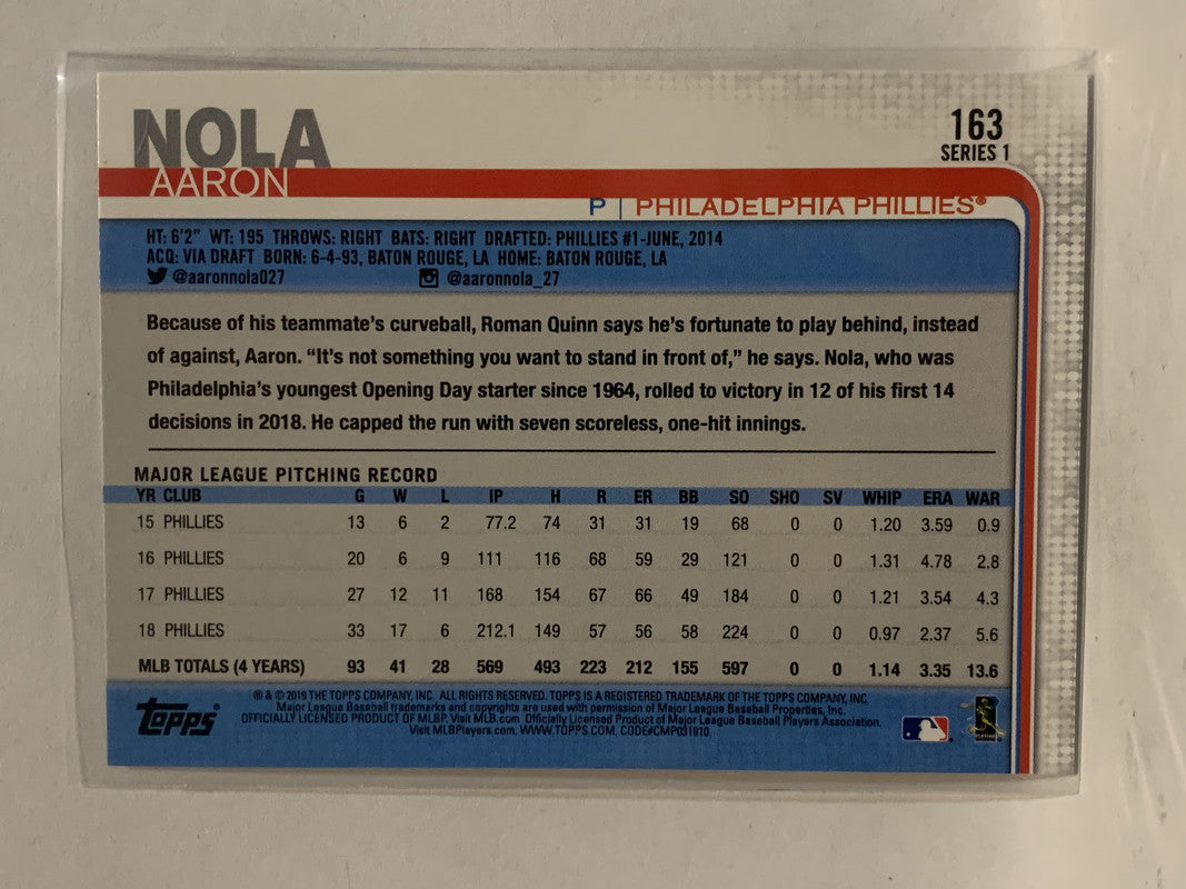 #163 Aaron Nola Philadelphia Phillies 2019 Topps Series One Baseball Card
