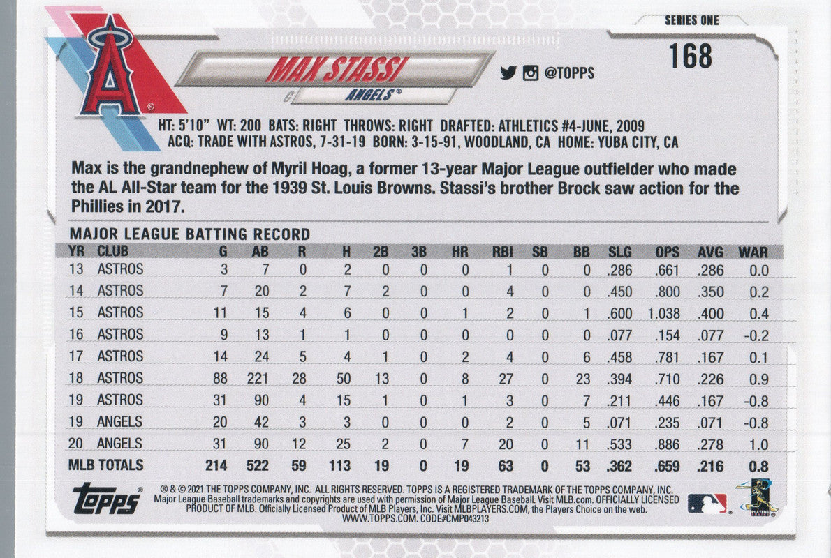 #168 Max Stassi Los Angeles Angels 2021 Topps Series 1 Baseball Card