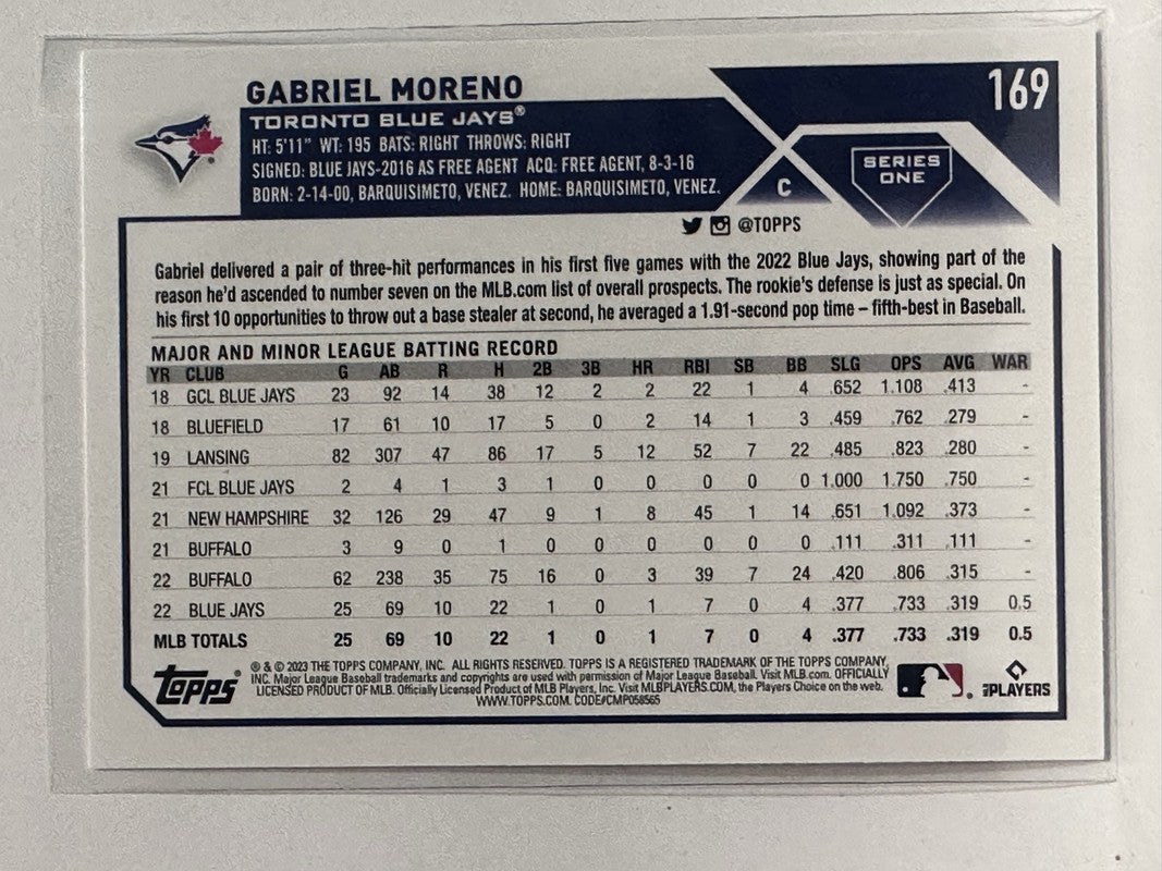 #169 Gabriel Moreno Rookie Toronto Blue Jays 2023 Topps Series One Baseball Card