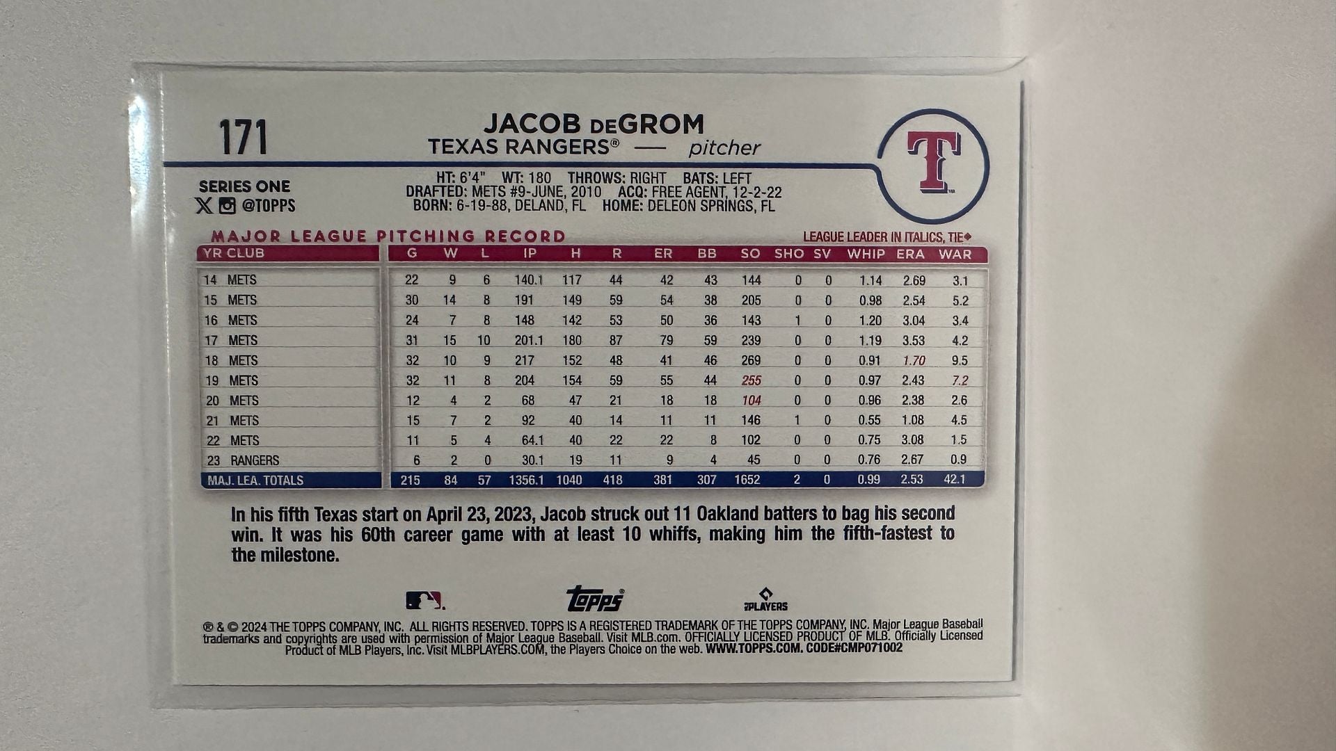 #171 Jacob DeGrom Texas Rangers 2024 Topps Baseball Card