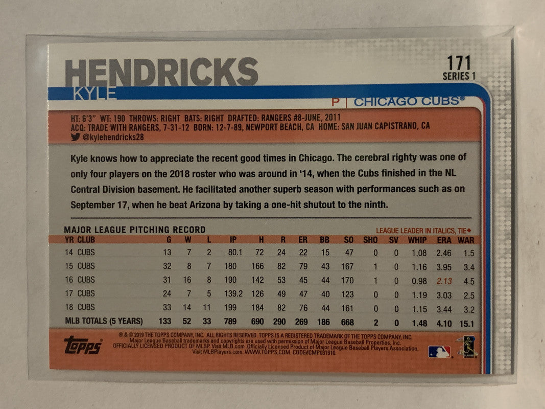 #171 Kyle Hendricks Chicago Cubs 2019 Topps Series One Baseball Card