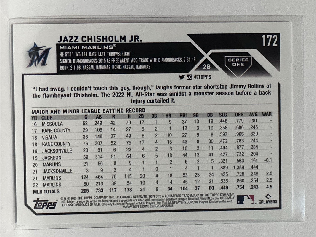 #172 Jazz Chisholm Jr Miami Marlins 2023 Topps Series One Baseball Card