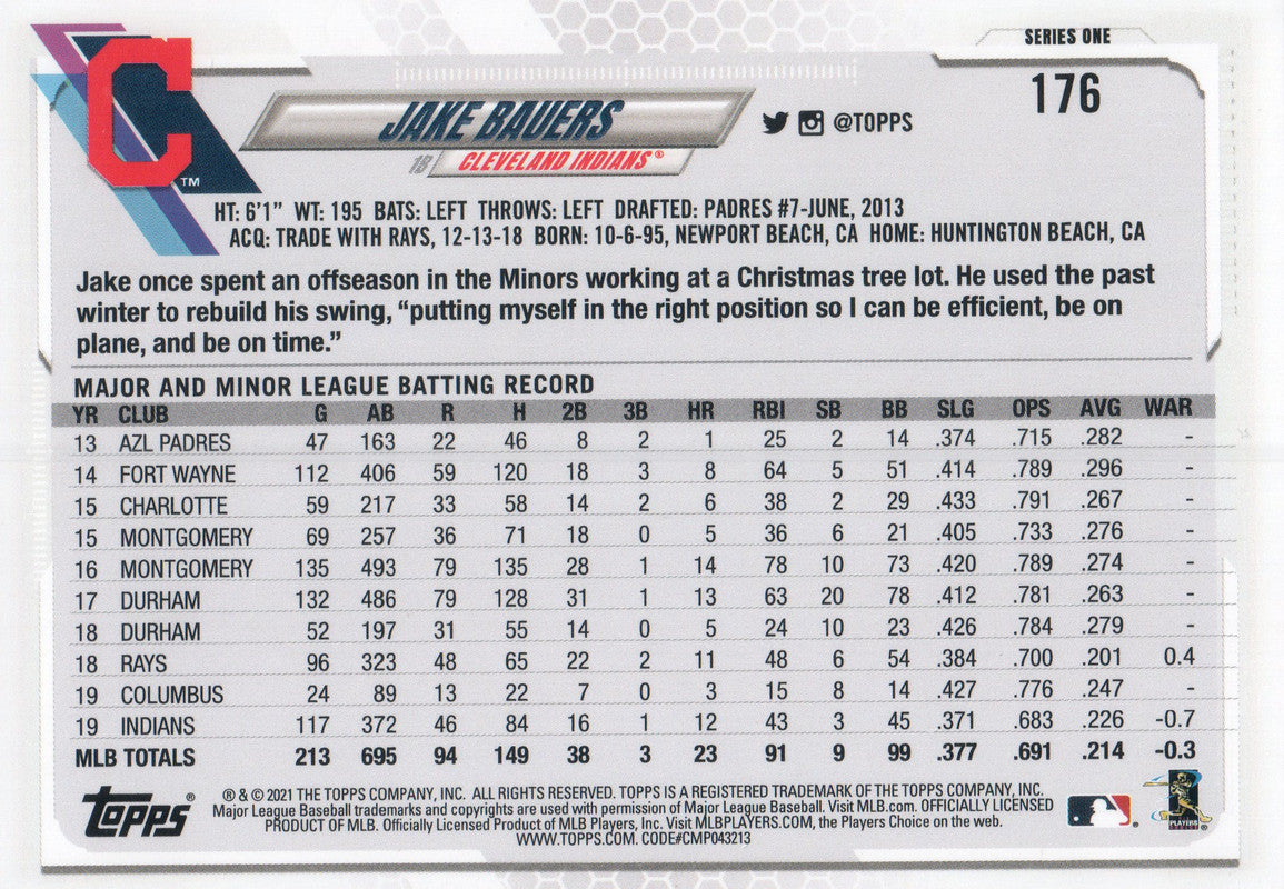 #176 Jake Bauers Cleveland Indians 2021 Topps Series 1 Baseball Card