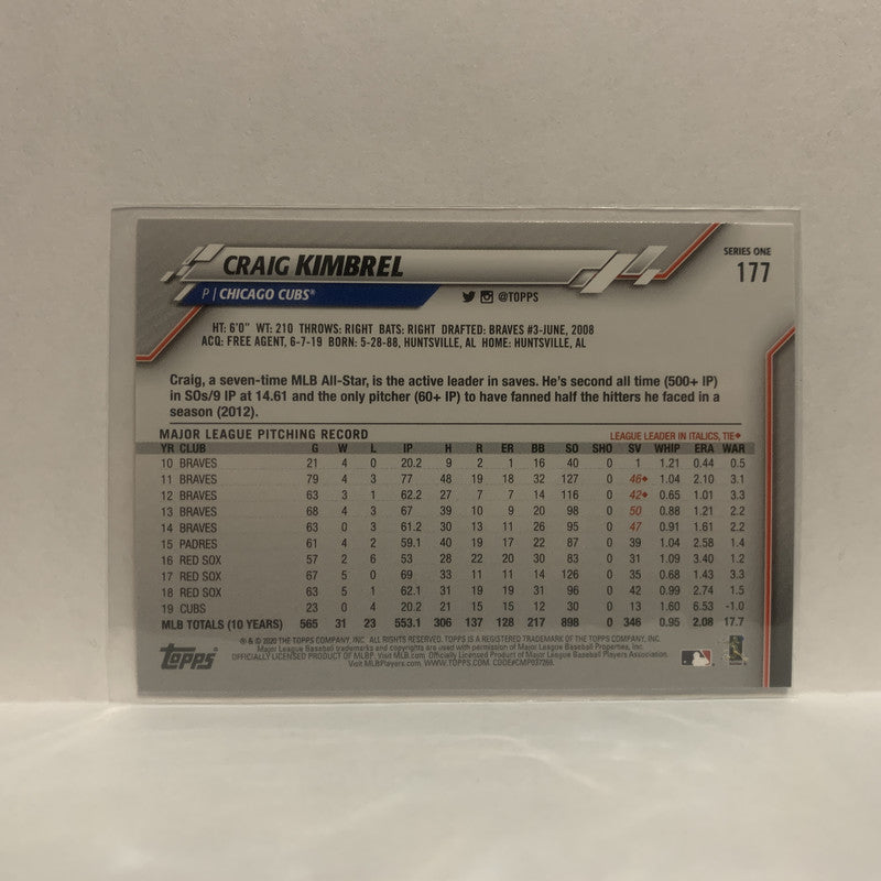 #177 Craig Kimbrel Chicago Cubs 2020 Topps Series One Baseball Card JE