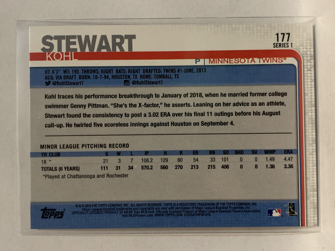 #177 Kohl Stewart Rookie Minnesota Twins 2019 Topps Series One Baseball Card