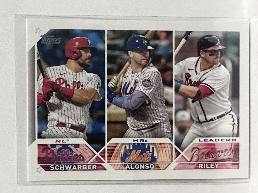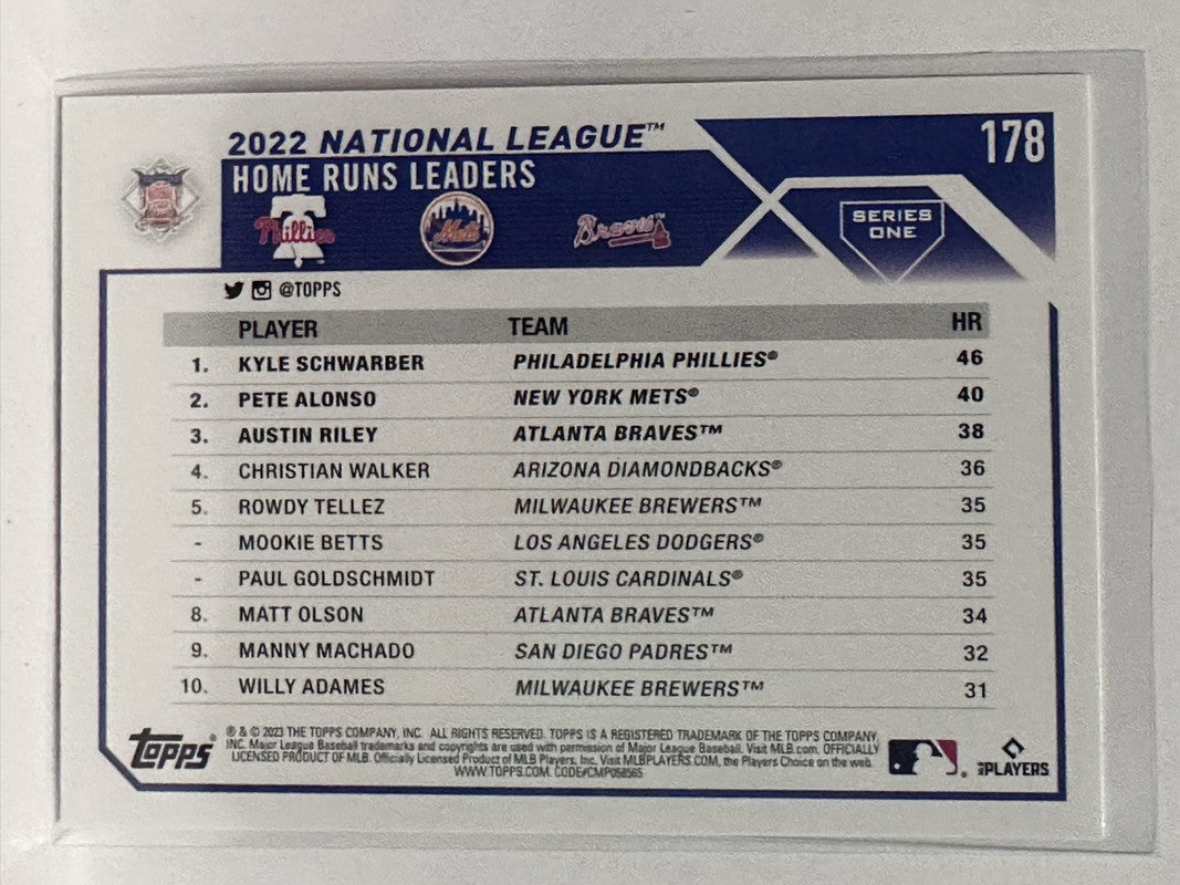 #178 Schwarber Alonso Riley Home Runs Leaders 2023 Topps Series One Baseball Card
