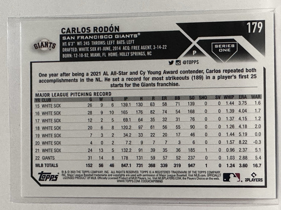 #179 Carlos Rodon San Francisco Giants 2023 Topps Series One Baseball Card