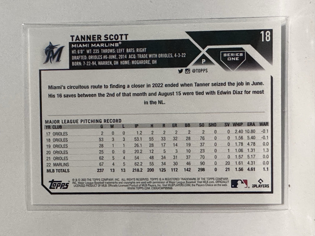 #18 Tanner Scott Miami Marlins 2023 Topps Series One Baseball Card
