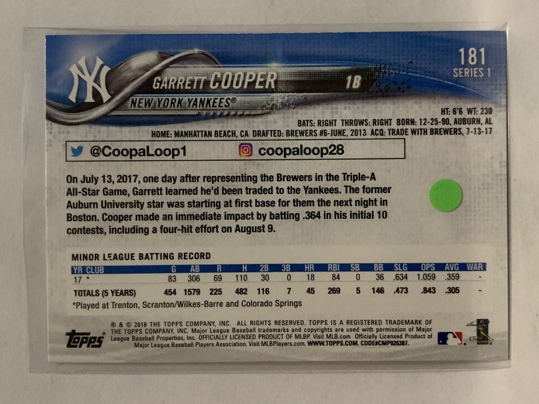 #181 Garrett Cooper Rookie New York Yankees 2018 Topps Series One Baseball Card
