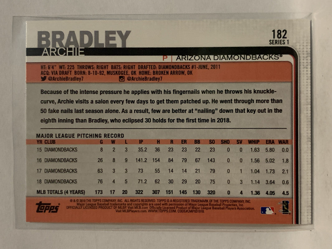 #182 Archie Bradley Arizona Diamondbacks 2019 Topps Series One Baseball Card