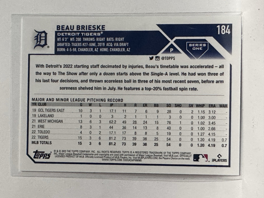 #184 Beau Brieske Detroit Tigers 2023 Topps Series One Baseball Card