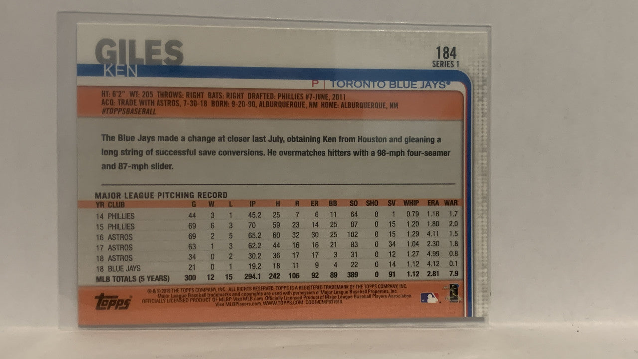 #184 Ken Giles Toronto Blue Jays 2019 Topps Series 1 Baseball Card