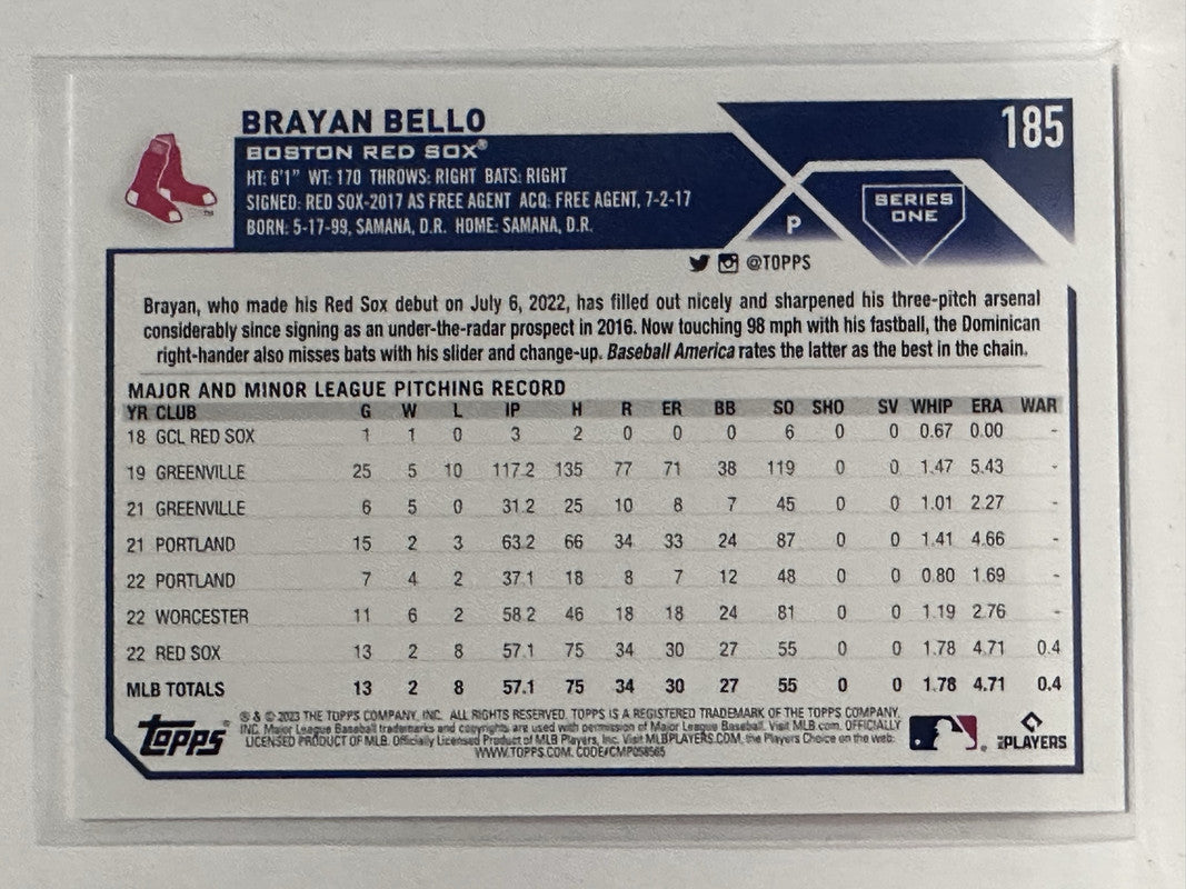 #185 Brayan Bello Rookie Boston Red Sox 2023 Topps Series One Baseball Card