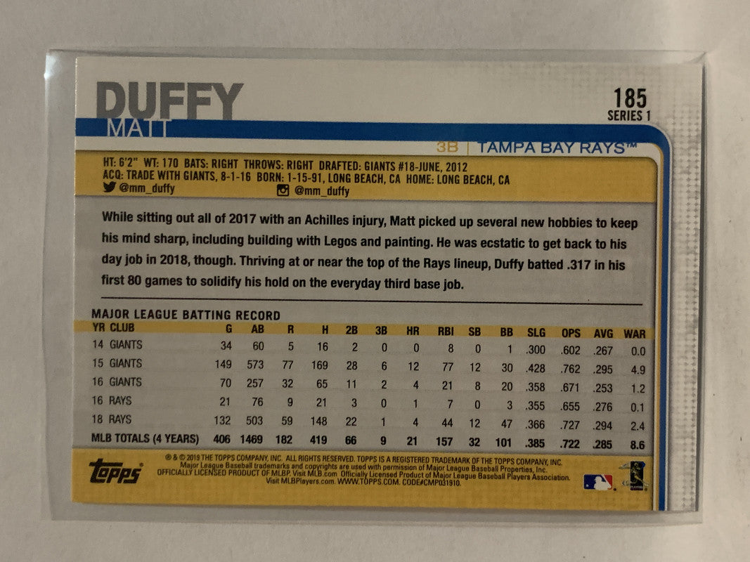 #185 Matt Duffy Tampa Bay Rays 2019 Topps Series One Baseball Card