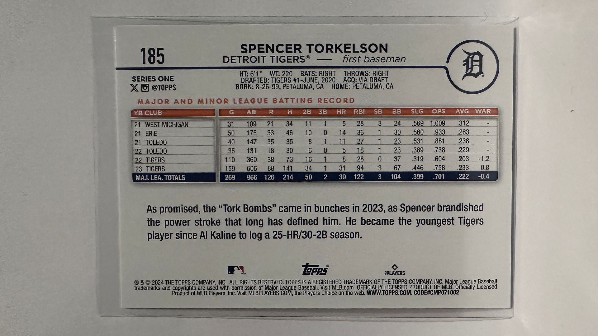 #185 Spencer Torkelson Detroit Tigers 2024 Topps Baseball Card