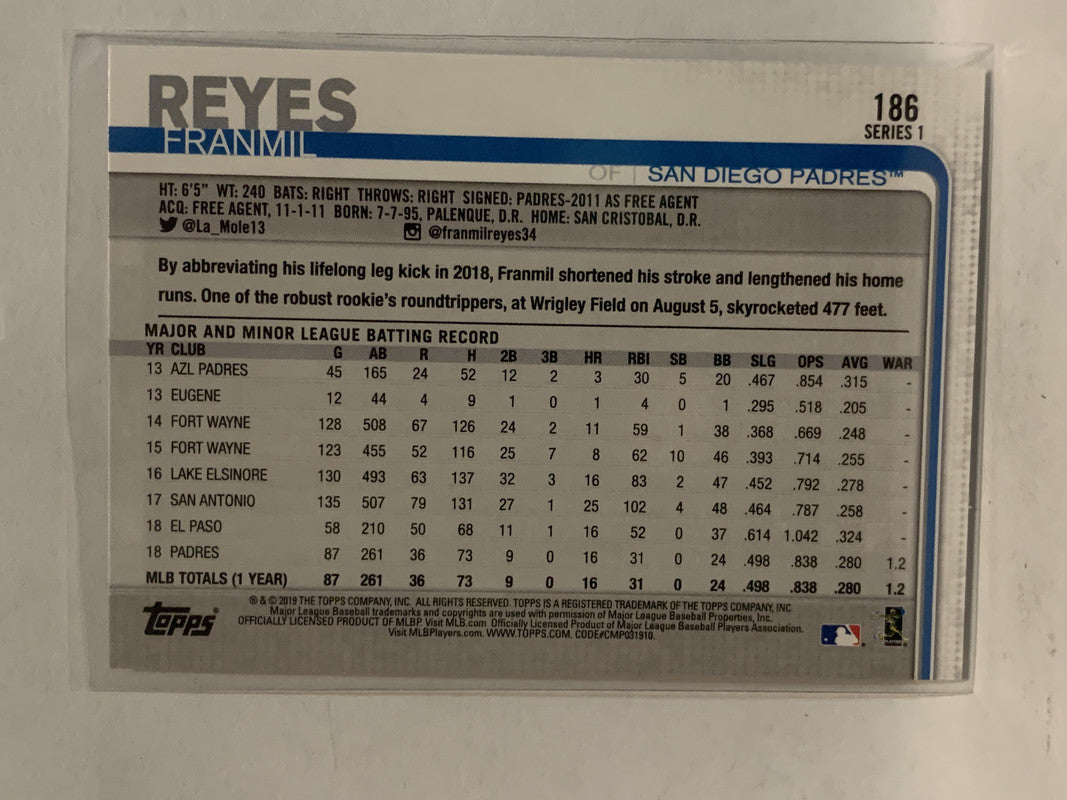 #186 Franmil Reyes Future Stars San Diego Padres 2019 Topps Series One Baseball Card