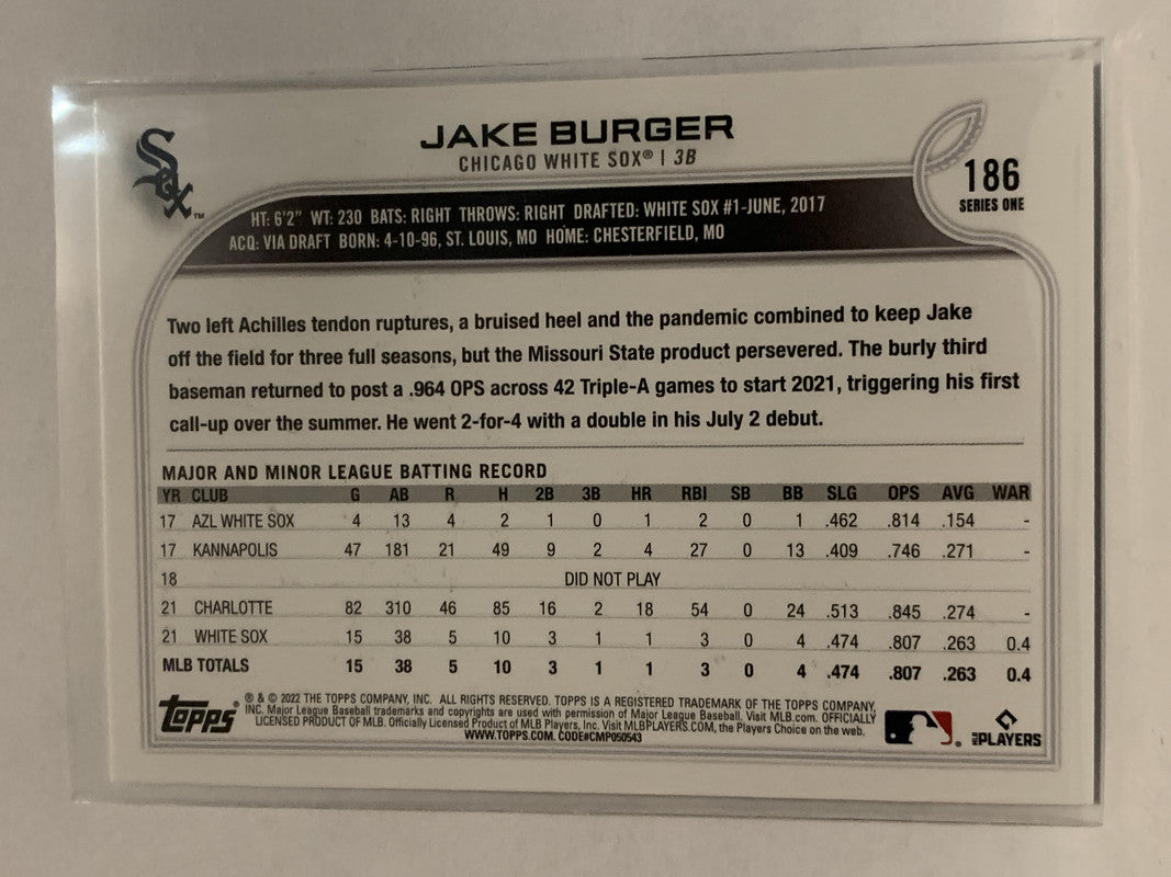 #186 Jake Burger Rookie Chicago White Sox 2022 Topps Series 1 Baseball Card MLB
