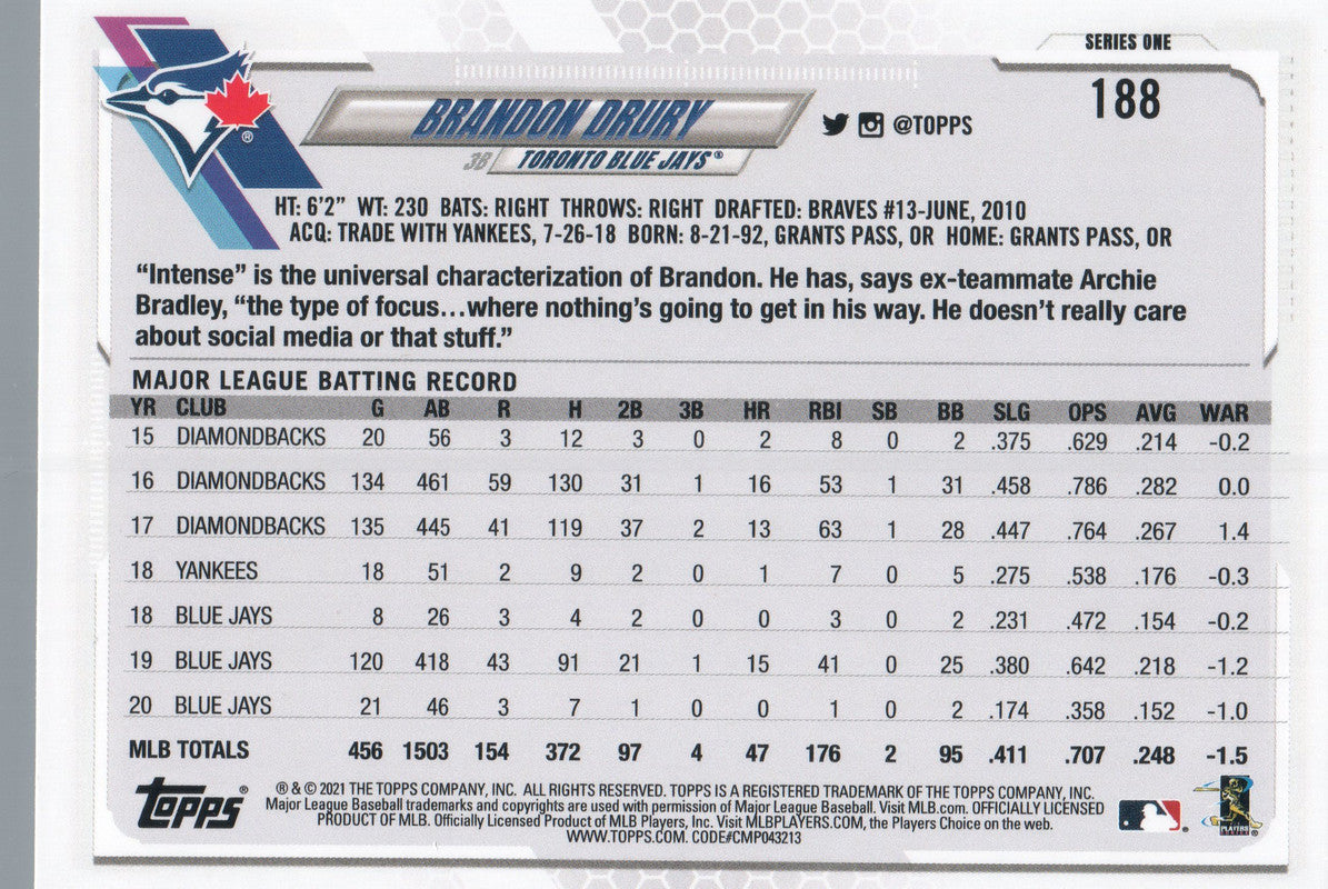 #188 Brandon Drury Toronto Blue Jays 2021 Topps Series 1 Baseball Card