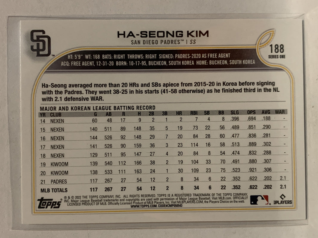 #188 Ha-Seong Kim San Diego Padres 2022 Topps Series One Baseball Card MLB