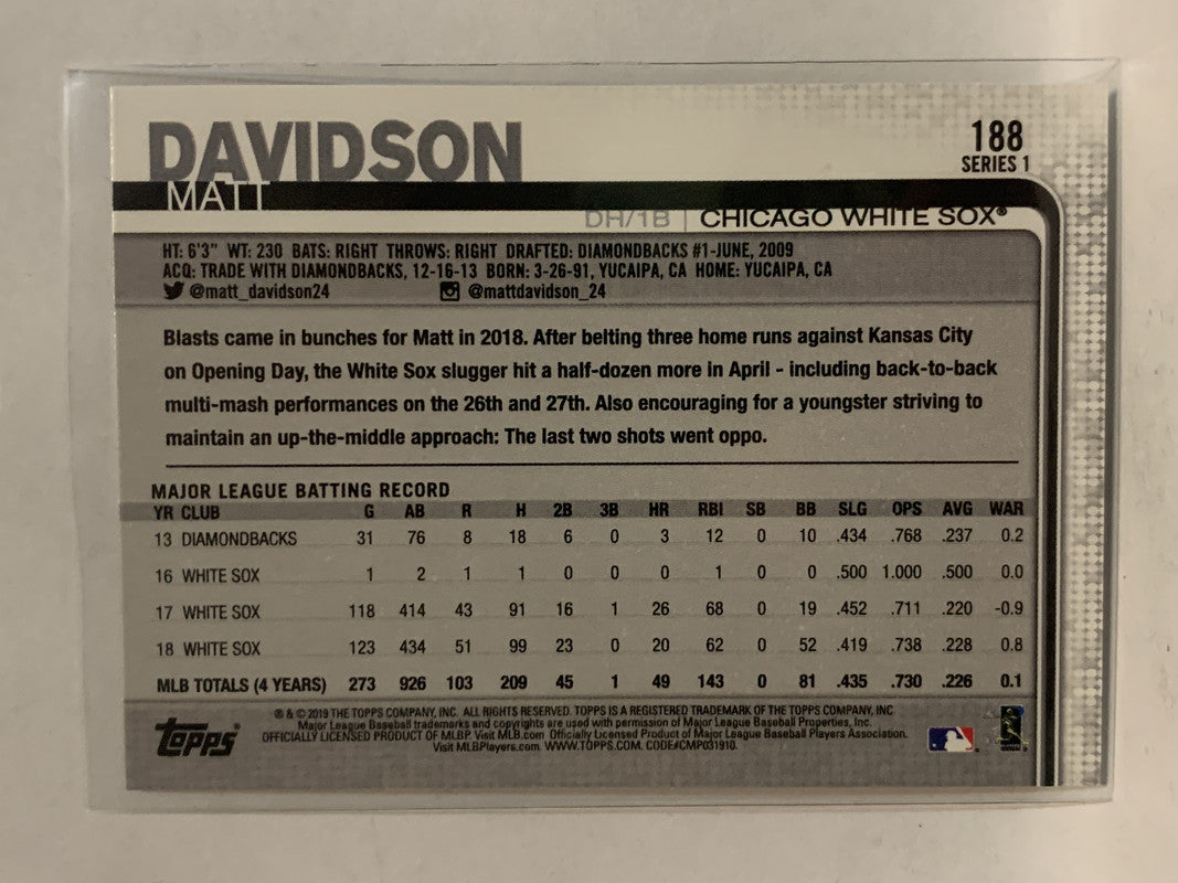 #188 Matt Davidson Chicago White Sox 2019 Topps Series One Baseball Card