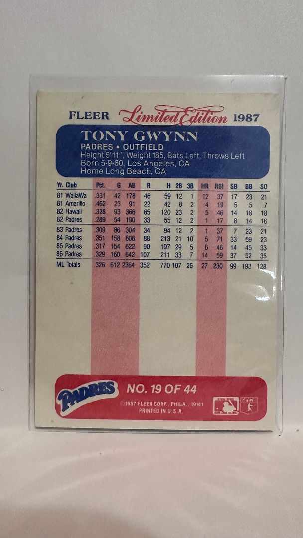 #19 of 44 Tony Gwynn San Diego Padres 1987 Fleer Limited Edition Baseball Card