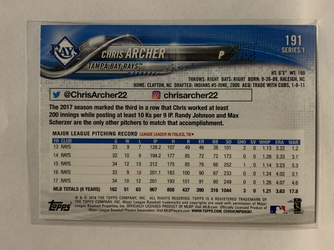 #191 Chris Archer Tampa Bay Rays 2018 Topps Series One Baseball Card