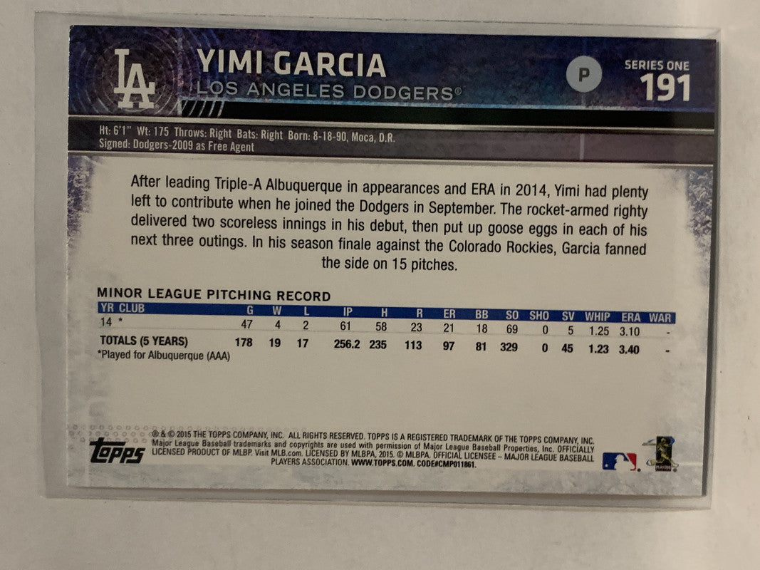 #191 Yimi Garcia Rookie Los Angeles Dodgers 2015 Topps Series One Baseball Card