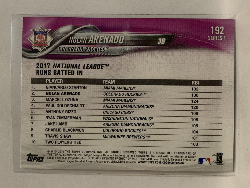 #192 Nolan Arenado League Leaders Colorado Rockies 2018 Topps Series One Baseball Card