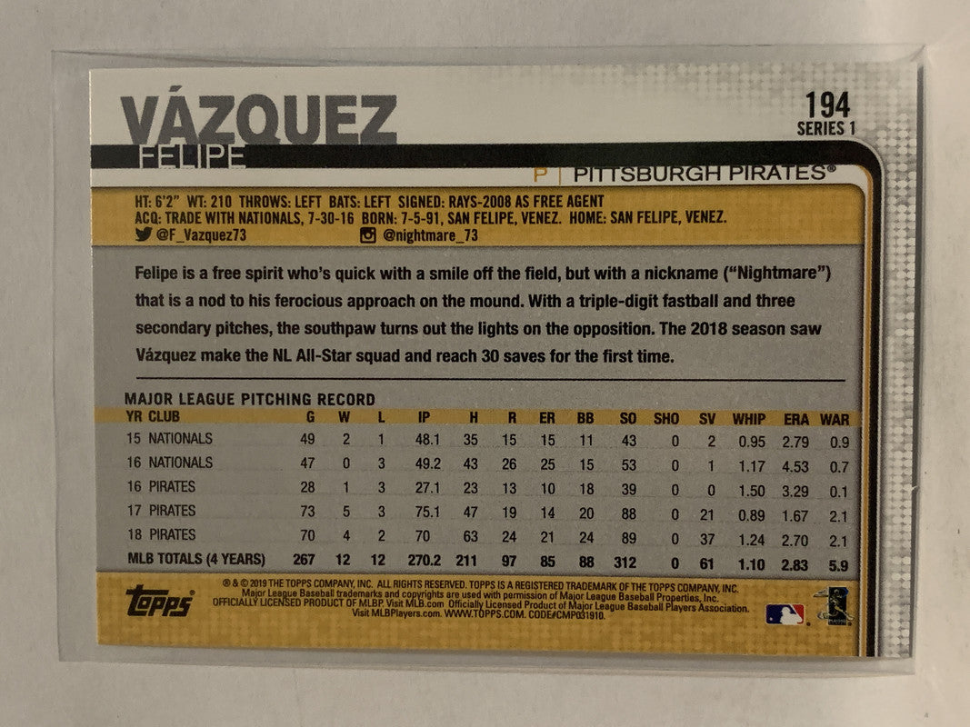 #194 Felipe Vazquez Pittsburgh Pirates 2019 Topps Series One Baseball Card