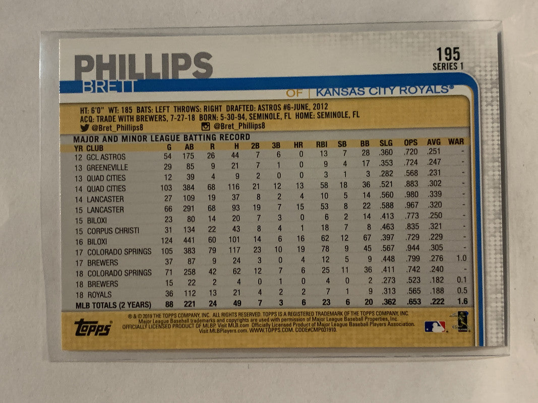 #195 Brett Phillips Kansas City Royals 2019 Topps Series One Baseball Card