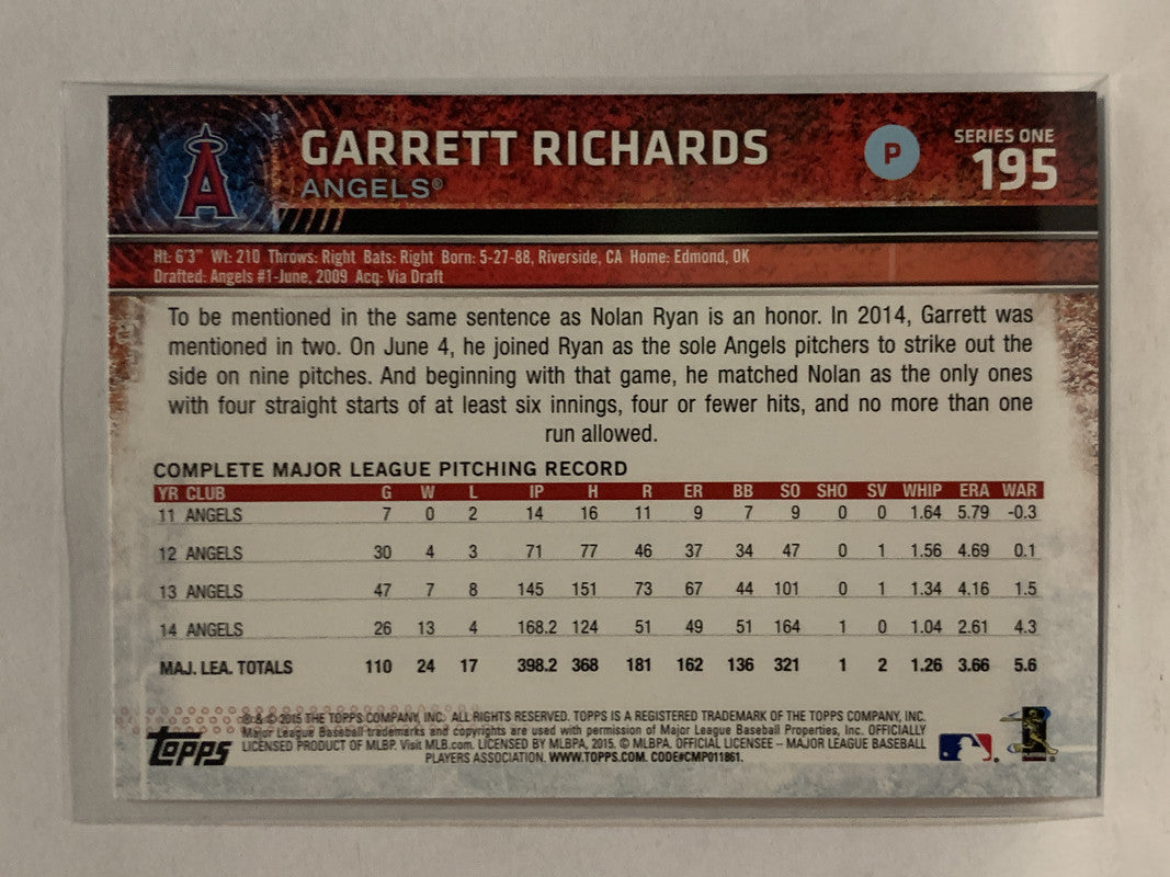 #195 Garrett Richards Los Angeles Angels 2015 Topps Series One Baseball Card