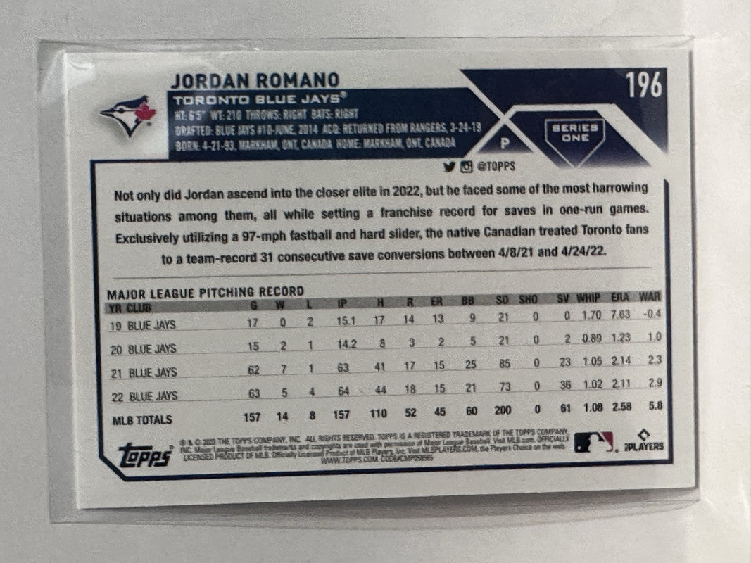 #196 Jordan Romano Toronto Blue Jays 2023 Topps Series One Baseball Card