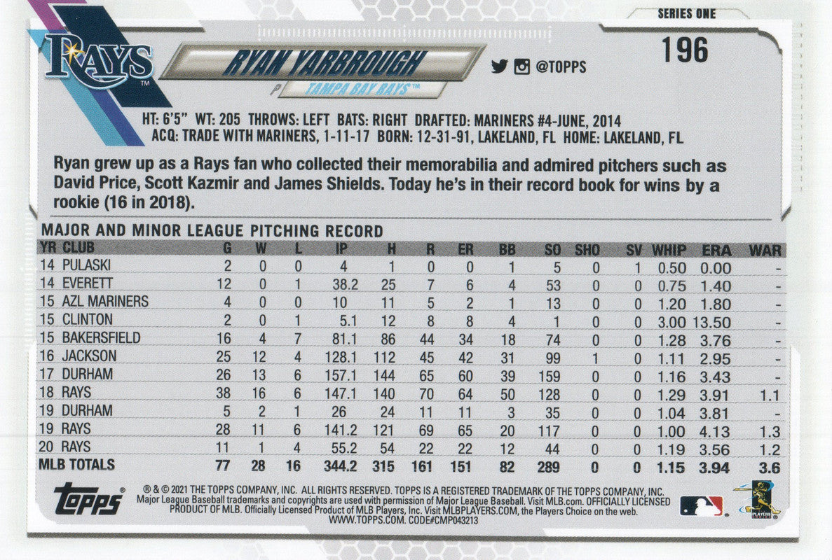 #196 Ryan Yarbrough Tampa Bay Rays 2021 Topps Series 1 Baseball Card