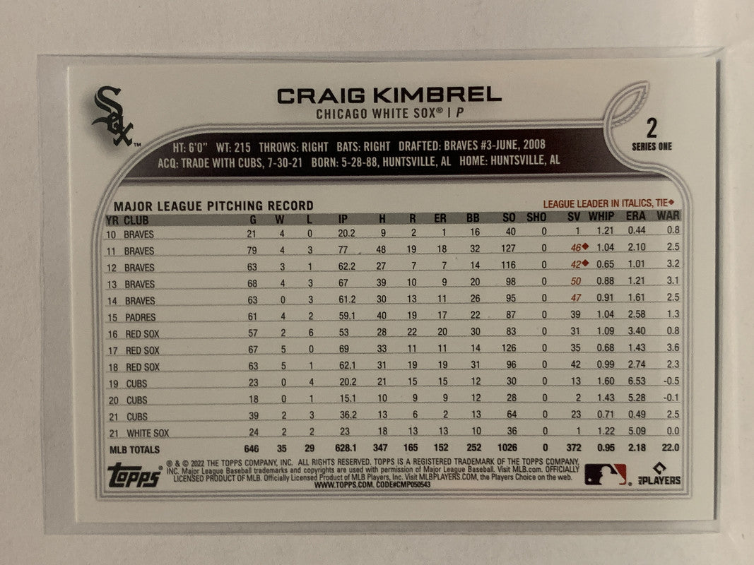 #2 Craig Kimbrel Chicago White Sox 2022 Topps Series One Baseball Card MLB