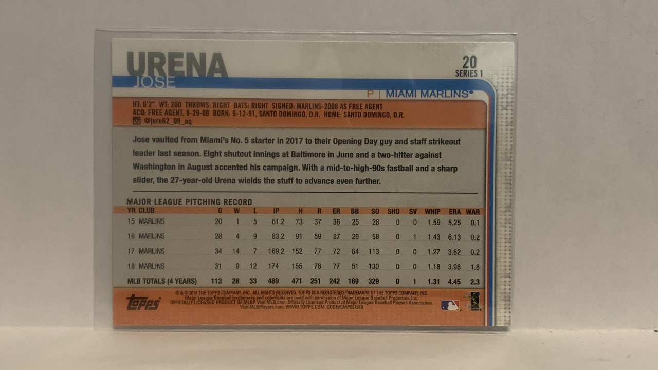 #20 Jose Urena Miami Marlins 2019 Topps Series 1 Baseball Card