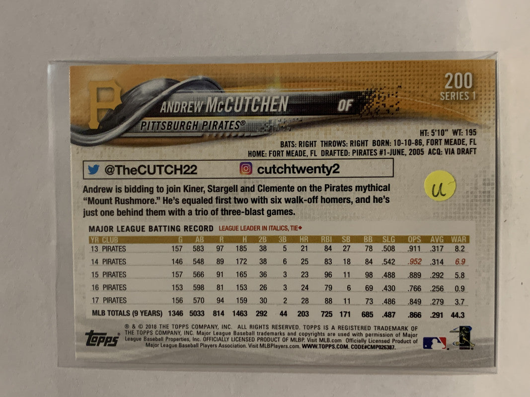 #200 Andrew McCutchen Pittsburgh Pirates 2018 Topps Series One Baseball Card MLB