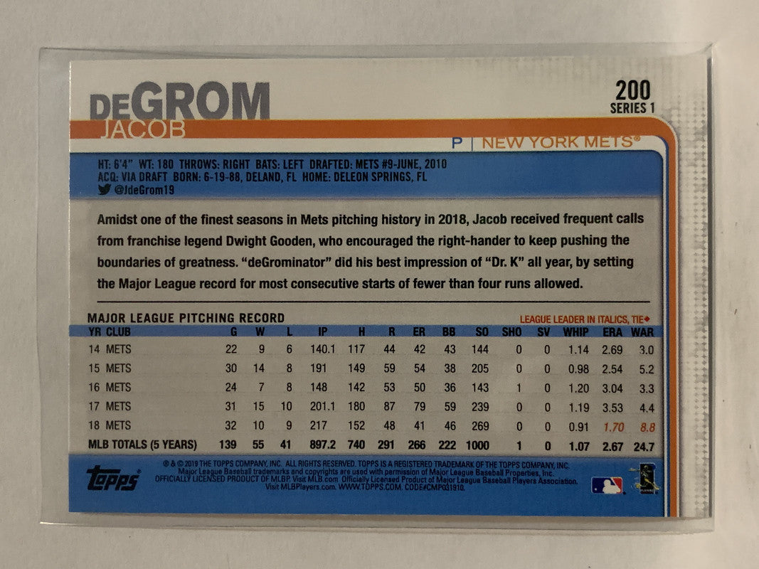 #200 Jacob DeGrom New York Mets 2019 Topps Series One Baseball Card