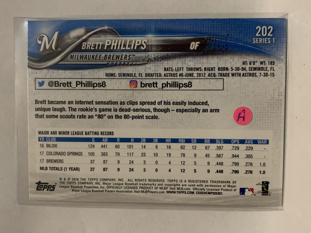 #202 Brett Phillips Milwaukee Brewers 2018 Topps Series One Baseball Card MLB