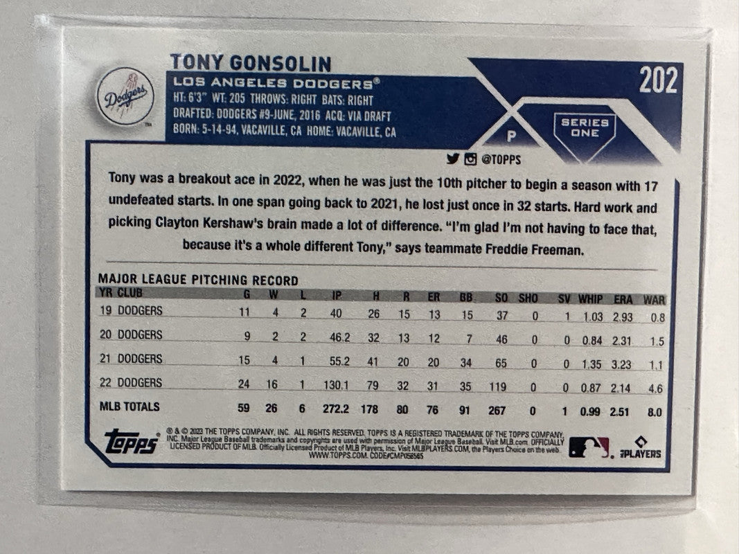 #202 Tony Gonsolin Los Angeles Dodgers 2023 Topps Series One Baseball Card
