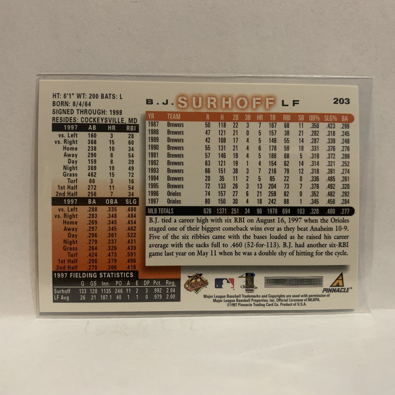 #203 B.J. Surhoff Baltimore Orioles 1997 Score Baseball Card IX