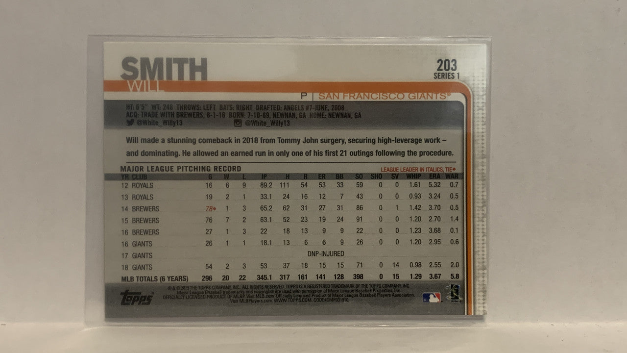 #203 Will Smith San Francisco Giants 2019 Topps Series 1 Baseball Card
