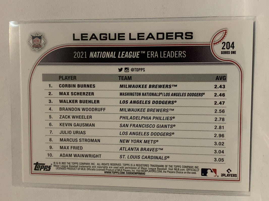 #204 Burnes Scherzer Buehler Era Leaders 2022 Topps Series One Baseball Card MLB