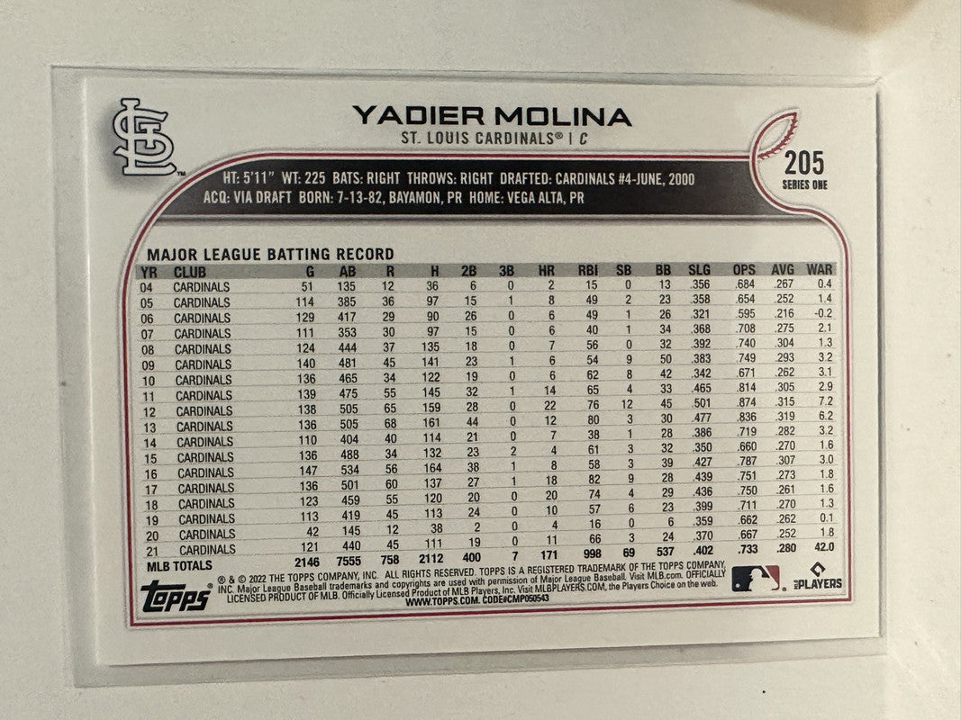 #205 Yadier Molina St Louis Cardinals 2022 Topps Series One Baseball Card