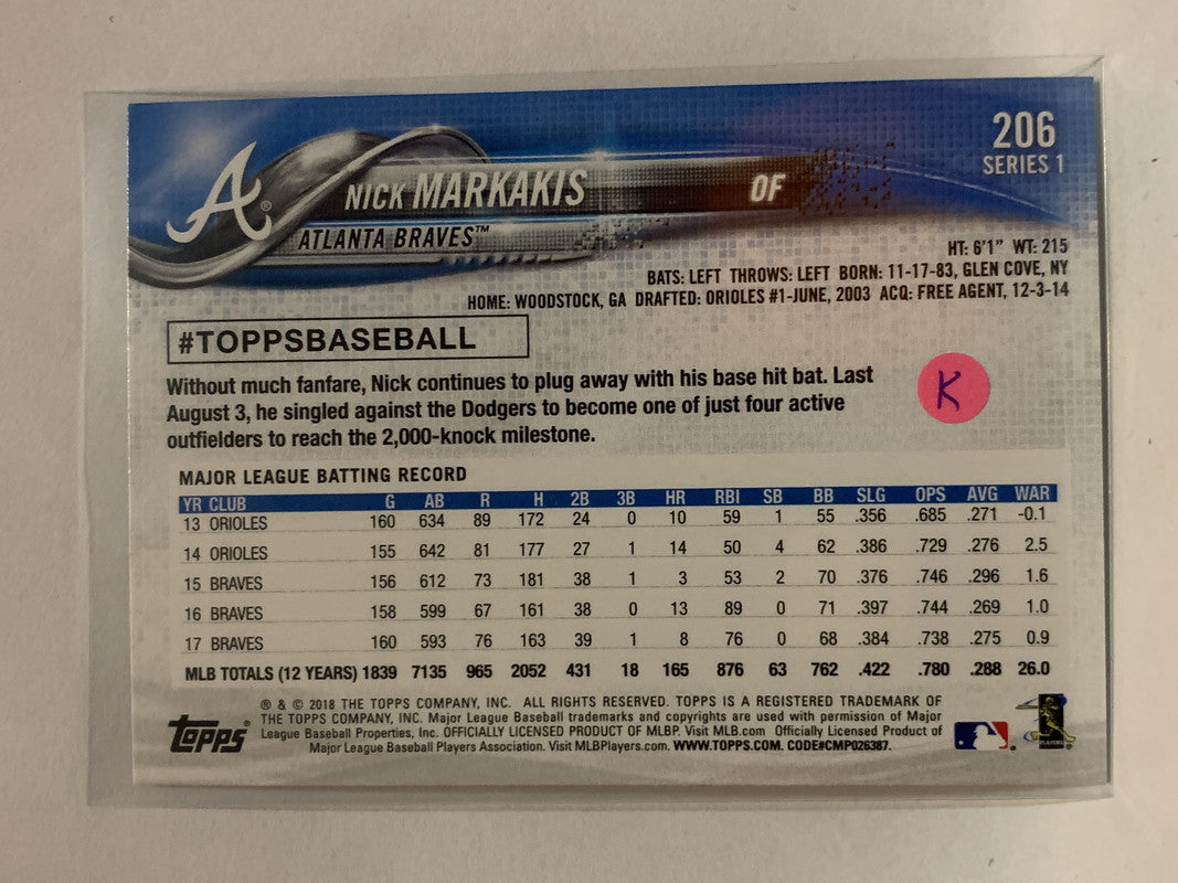 #206 Nick Markakis Atlanta Braves 2018 Topps Series One Baseball Card MLB