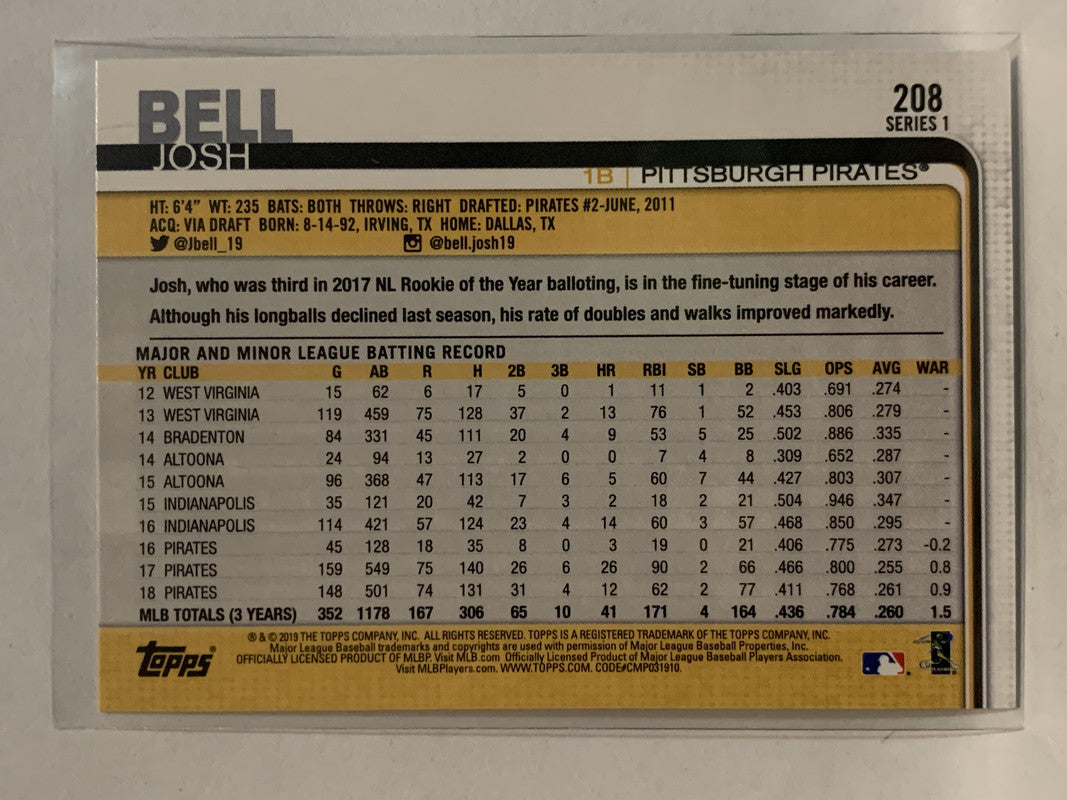 #208 Josh Bell Pittsburgh Pirates 2019 Topps Series One Baseball Card