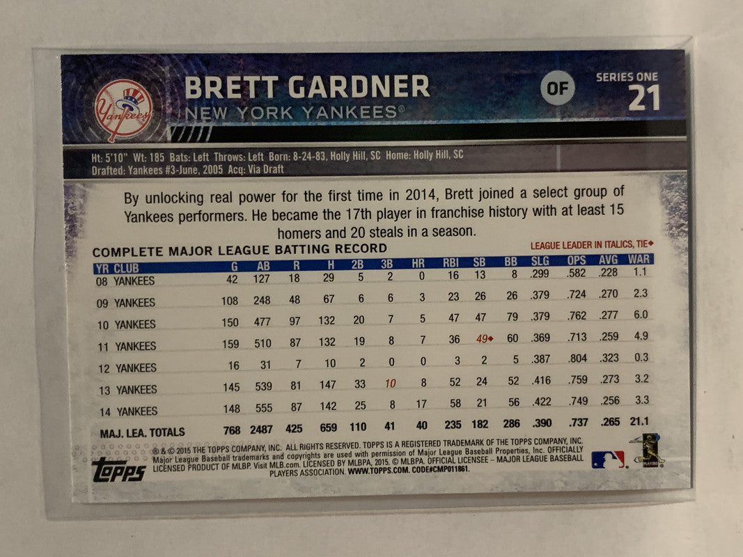 #21 Brett Gardner New York Yankees 2015 Topps Series One Baseball Card