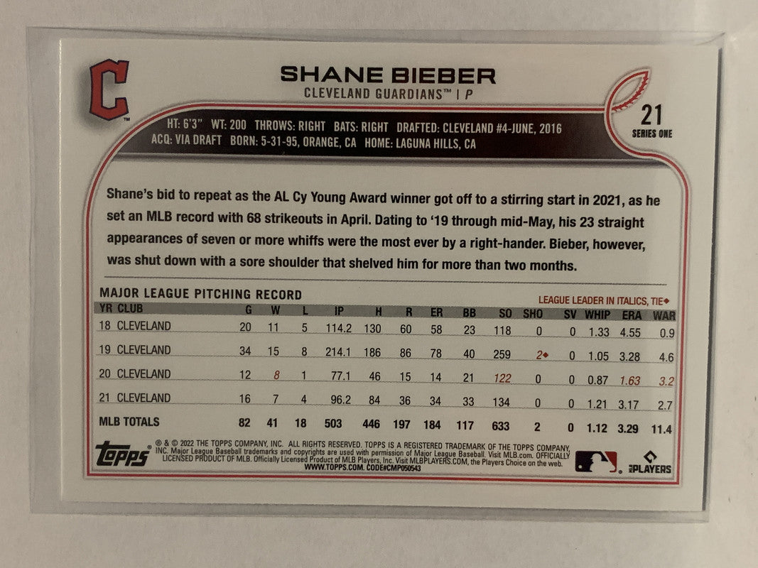 #21 Shane Bieber Cleveland Guardians 2022 Topps Series One Baseball Card MLB