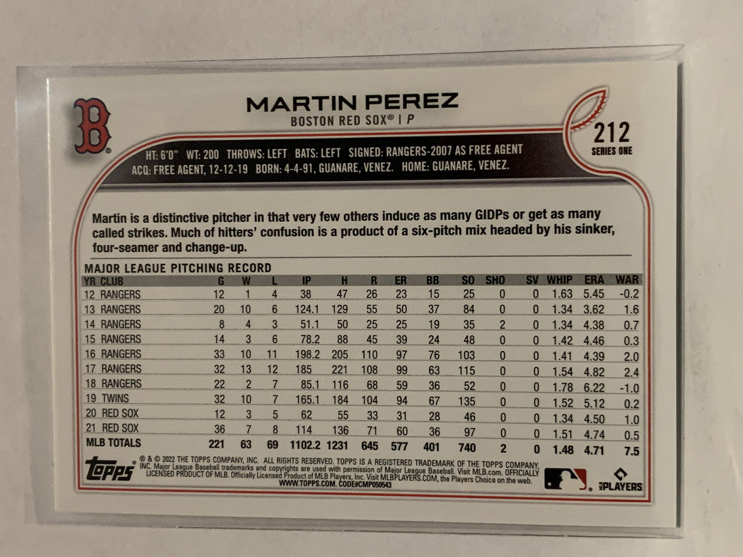 #212 Martin Perez Boston Red Sox 2022 Topps Series One Baseball Card MLB