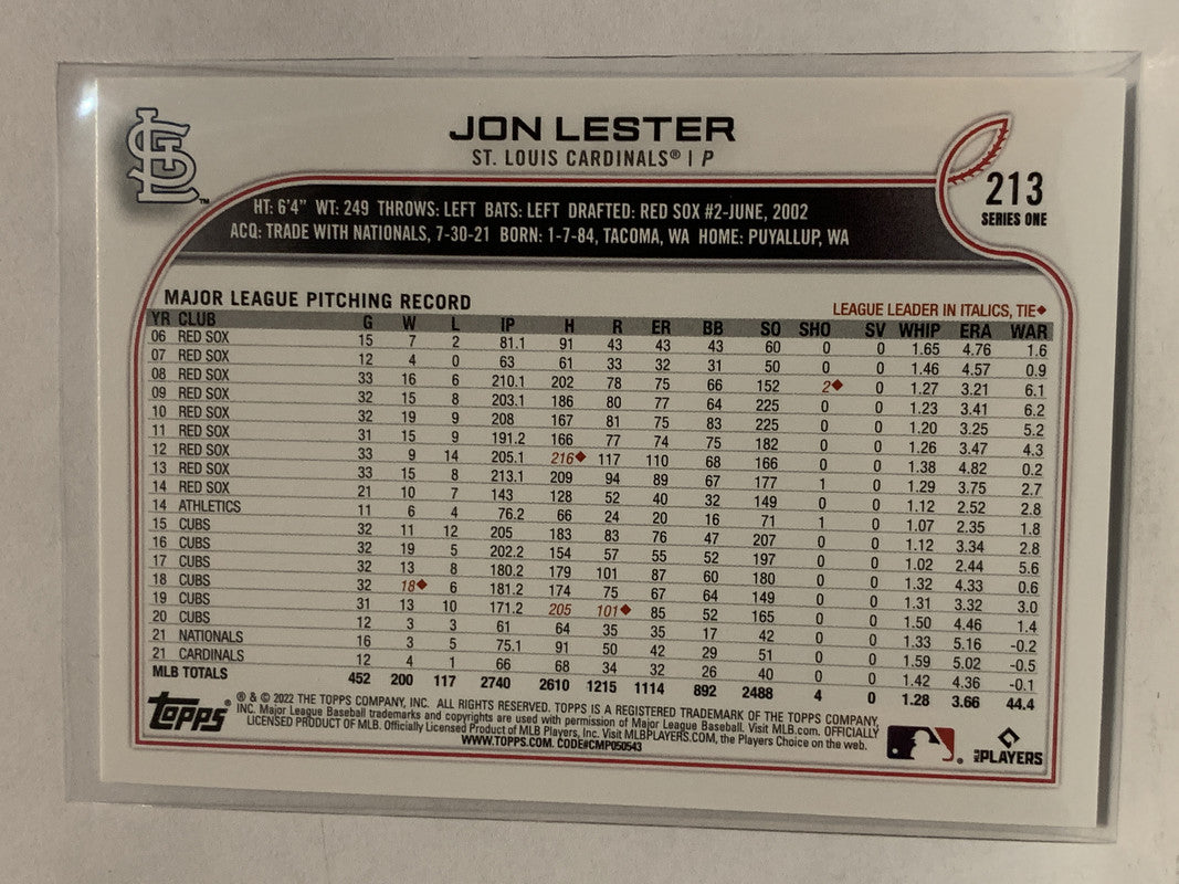 #213 Jon Lester St Louis Cardinals 2022 Topps Series One Baseball Card MLB